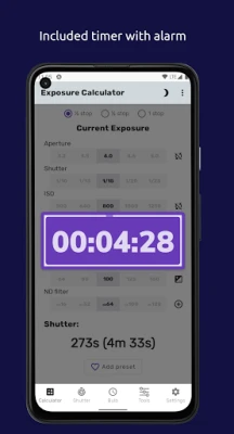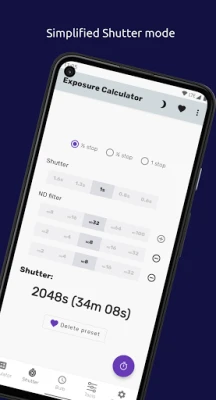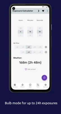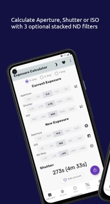 Exposure Calculator er designet til at strømline din arbejdsgang og udvide dine kreative horisonter. Den inkluderer en indbygget timer med alarm for eksponeringer på 4 sekunder eller længere, hvilket sikrer, at hvert skud er perfekt timet. Udnyt specialfunktioner som 'bulb mode' for eksponeringer op til 24 timer, omvendt filtersøgning, og en kalibreringsmulighed for ND-filtre for at opnå maksimal nøjagtighed. Med ubegrænset antal forudindstillinger kan du gemme dine foretrukne indstillinger og hurtigt genkalde dem ved behov.