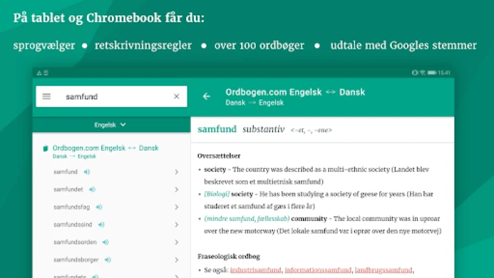 Ordbogen-appens intuitive design præsenterer information i lettilgængelige artikler, der er enkle at navigere i. For at sikre en nuanceret forståelse af ord i kontekst, suppleres hvert opslag med relevante eksempelsætninger. Med professionel sprogsupport på fem nøglesprog – dansk, engelsk, tysk, fransk og spansk – er din sprogrejse dækket. Applikationen er tilgængelig på din Chromebook og tilbyder fleksible loginmuligheder via WAYF, UNI-Login, brugernavn eller din institutions Wi-Fi, og giver dig desuden mulighed for at benytte den under eksamener.