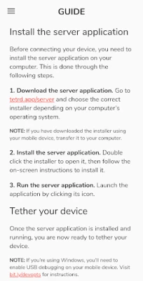 `tetrd` er designet til enkelhed og ydeevne, uden at du skal bekymre dig om komplekse opsætninger. Nyd lynhurtige forbindelseshastigheder på over 200Mbps på mange enheder, helt uden behov for root-adgang eller USB-debugging (med undtagelse af Windows). Du kan endda forbinde flere enheder samtidigt via omvendt tethering, samt drage fordel af avancerede funktioner som adgang til dit lokale netværk og automatisk forbindelse. Vores løsning anvender en lokal VPN for at sikre dataoverførsel via USB, og vi garanterer, at ingen data, der passerer gennem denne VPN, bliver brugt, indsamlet eller delt. For at få den fulde oplevelse kræver `tetrd` en tilhørende applikation på din computer, hvilket sikrer en problemfri og sikker forbindelse mellem dine enheder.